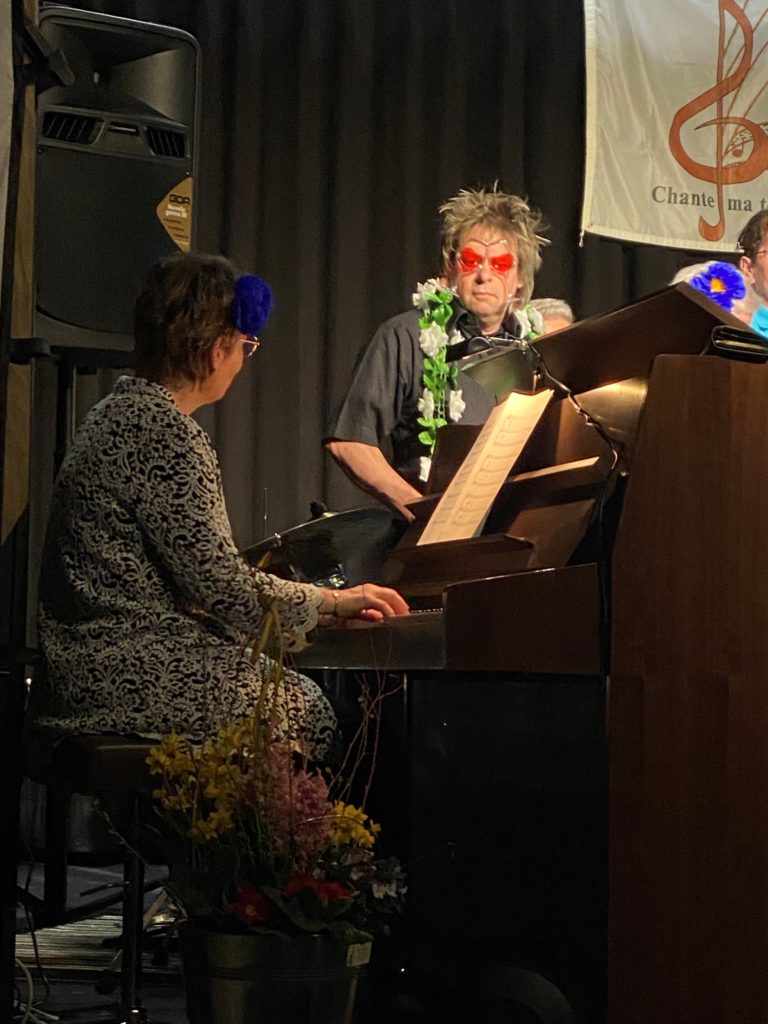 La pianiste Martine Caillet et Emmanuel Joliat à la batterie ont apporté un accompagnement lumineux, bien en accord avec l’esprit de la soirée. Face à eux, une salle pleine de spectateurs actifs, souriants et manifestement heureux de partager ce moment.